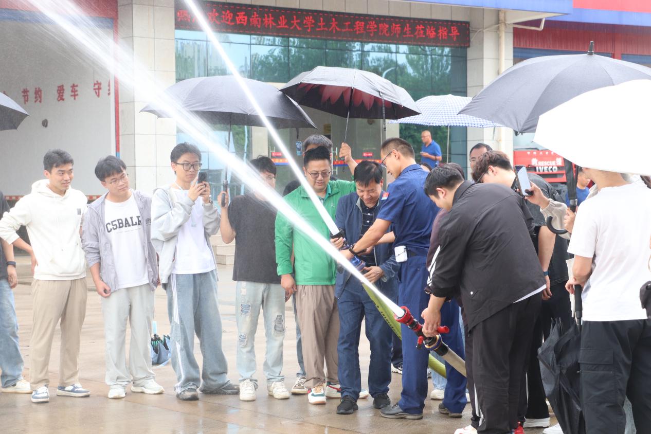 最令师生们震撼的是消防救援科目展示环节。特勤大队三站指战员现场演示了“纵深灭火操”“高空绳索救援人员转移”“绳索T型救援”“地震废墟破拆”等实战科目。只见消防员身着抢险救援服及个人防护装备,利用绳索在训练塔上快速垂降,仅用3分钟便完成“被困人员”转移;在“废墟”中,他们通过液压扩张器、顶杆等工具,精准破拆混凝土板,为“受困者”开辟救生通道。“原来课本里的‘救援流程’在实战中需要这么多细节配合!”消防工程2022级员工感慨道,“今天的参观让我真正理解了‘黄金72小时’救援中,每一秒都关乎生命。”